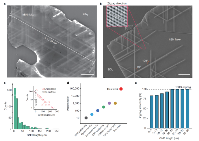 在层间生长的石墨烯纳米带长度可达亚毫米量级,远大于以往报道的结果。结合其亚5纳米的宽度,层间纳米带的长宽比达到了105,比以往的结果大至少两个数量级。更重要的是,层间纳米带的具有统一的zigzag手性结构。统计结果表明,zigzag 纳米带的纯度随长度上升,且长度在20微米以上的纳米带全部为zigzag手性。理论上zigzag纳米带边缘存在自旋极化拓扑边缘态,对自旋电子学和自旋量子计算器件具有潜在的应用前景。
