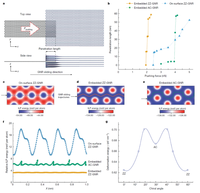 为了揭示六方氮化硼层间超长zigzag 石墨烯纳米带的生长机理,史志文教授团队与武汉大学欧阳稳根教授团队、特拉维夫大学Michael Urbakh教授团队、深圳先进技术研究院丁峰教授团队的密切合作,发现层间超长zigzag 纳米带的形成是hBN层间超润滑特性(近零摩擦损耗)的结果。在生长过程中,石墨烯纳米带会在生长驱动力的作用下不断嵌入到hBN层间,必然涉及纳米带与hBN之间的相对滑移。研究人员通过进行分子动力学模拟和理论模拟发现,由于hBN特殊的晶体结构,纳米带在hBN层间的摩擦力显著小于在其表面的摩擦力。这解释了hBN层间生长的纳米带长度远超以往在hBN表面生长结果的反直觉现象。此外,相对于其他手性的纳米带,zigzag 纳米带可以在层间进行近乎无摩擦的滑动,最终导致了石墨烯纳米带的手性选择性生长。