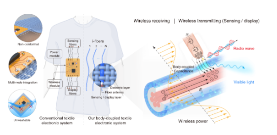 4月5日,东华大学材料科学与工程学院先进功能材料课题组在Science(《科学》)上发表了题为“Single body-coupled fiber enables chipless textile electronics”的研究论文。该研究提出了基于“人体耦合”的能量交互机制,并成功研发出集无线能量采集、信息感知与传输等功能于一体的新型智能纤维,由其编织制成的智能纺织品无需依赖芯片和电池便可实现发光显示、触控等人机交互功能,这一突破性成果为人与环境的智能交互开辟了新可能,具有广泛应用前景。