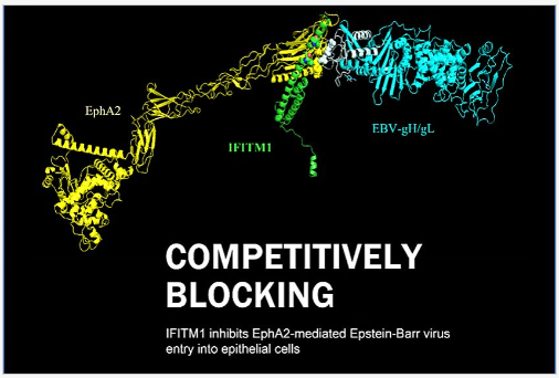 为了深入理解IFITM1抑制EBV感染的机制,研究团队探索发现IFITM1可内源和外源性地竞争性阻断上皮细胞受体EphA2与EBV糖蛋白gH/gL和gB的结合,从而抑制病毒的侵入。3D蛋白质结构分析和相关实验证实,IFITM1在EphA2和病毒糖蛋白之间形成了一种“钳形”的竞争性互动结构。IFITM1上的两个氨基酸残基(Tyr112和Leu104)对于抑制EphA2与病毒糖蛋白结合发挥着至关重要的作用。这两个残基的突变直接削弱了IFITM1的抗病毒效能,并增强了EphA2与病毒蛋白的结合力。