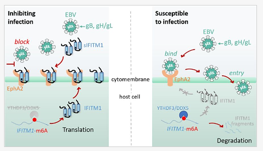 研究团队进一步发现IFITM1-mRNA存在表观遗传修饰位点。YTHDF3作为m6A甲基化修饰位点识别蛋白,与ATP依赖性RNA解旋酶家族成员DDX5形成互作,影响IFITM1 mRNA的稳定性及表达水平,进而影响上皮细胞对EBV的易感性。