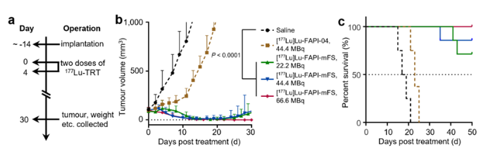 图4 [177Lu]CTR-FAPI可几乎完全抑制肿瘤生长,并延长小鼠生存期。a、治疗方案;b、肿瘤生长曲线;c、生存曲线