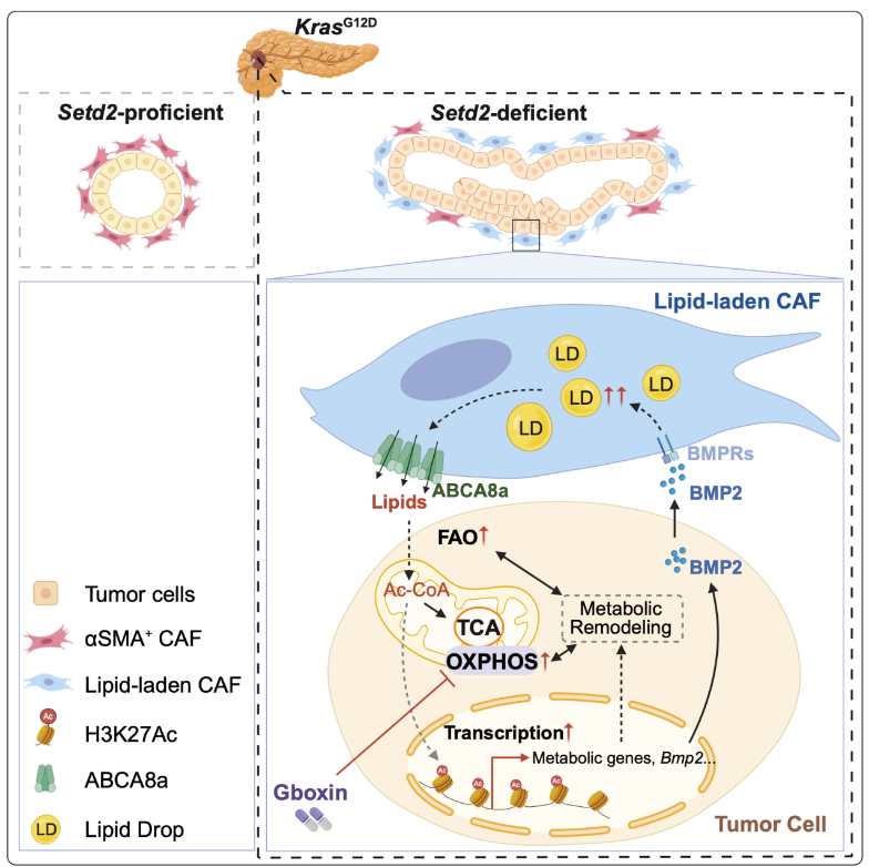 进一步机制探索了这类富脂型CAF的调控和功能机制。SETD2缺陷型胰腺肿瘤细胞通过BMP2-BMPR信号轴激活CAF细胞成脂途径,促进其脂质合成。 反过来,这类富脂型CAF通过ABCA8a 转运蛋白反向给肿瘤细胞供给脂质, 促进SETD2缺陷型肿瘤细胞内脂肪酸氧化-OXPHOS代谢重塑以及干性增强。通过转录组-CUT&Tag联合分析显示,SETD2缺陷型肿瘤细胞内通路的改变并非受H3K36me3丢失的直接调控,而主要由SETD2缺陷引发的H3K27Ac重排贡献。
