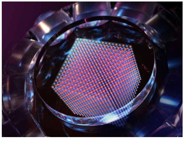 图.“天元”量子模拟器示意。红色和蓝色的小球分别代表自旋相反的原子,它们在三维空间交错排列,形成了反铁磁晶体。原子被光晶格囚禁在玻璃真空腔中。/制图:陈磊