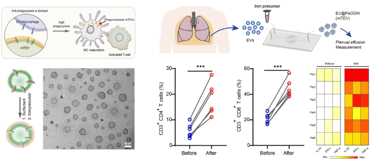 与通过基因工程手段在体外改造高度敏感、高度异质性的免疫细胞相比,设计自体肿瘤疫苗以在体内激活免疫细胞,成为一种有前景的自体免疫治疗策略。肿瘤细胞能够源源不断、高产率生成和释放囊泡到组织液和体液中,这些肿瘤来源的囊泡富含大量反映其肿瘤来源的特征蛋白和核酸抗原,为免疫细胞提供了高丰度的肿瘤抗原信息。此外,这种癌性囊泡的收集相对简单,不仅可以从临床切除的组织中培养癌细胞获得,还可以直接从患者的生理、病理体液(如恶性腹水或胸腔积液)中大量提取。因此,利用癌性囊泡制备自体肿瘤疫苗,用于免疫疗法具有很大优势。团队前期对生物囊泡材料的成分解析、有效利用进行了系列研究(Anal. Chem. 2022, 14794; Adv. Sci. 2023, 2204814; ACS Nano 2024, 9613; Nature Communications 2024, 3343),最新研究发现,癌细胞释放的囊泡表面可能携带免疫逃逸分子,这些分子干扰了免疫细胞的吞噬信号,导致免疫细胞无法摄取癌性抗原,进一步影响其有效识别和攻击肿瘤。因此,调控免疫细胞与癌性囊泡之间的生物信号识别,成为有效利用癌性囊泡抗原,研发自体肿瘤疫苗的关键。