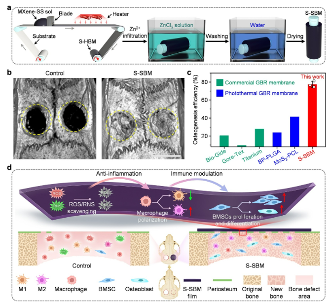 为了实现高性能二维纳米复合薄膜材料的连续化制备,该工作创新性地开发了卷对卷辅助刮涂结合有序界面交联的新策略(图1)。规模化制备有序交联的MXene(S-SBM)薄膜具有高拉伸强度(755 MPa)和韧性(17.4 MJ m-3),强力学自支撑性有利于维持成骨所需空间。此外,该S-SBM薄膜具有高效清除ROS/RNS和促进巨噬细胞M2极化等成骨微环境调控作用。最终,相比商用引导骨再生(GBR),S-SBM薄膜具有更高的体内成骨效率(8周新生骨体积分数高达77.4%),在临床骨修复领域具有重要应用前景。