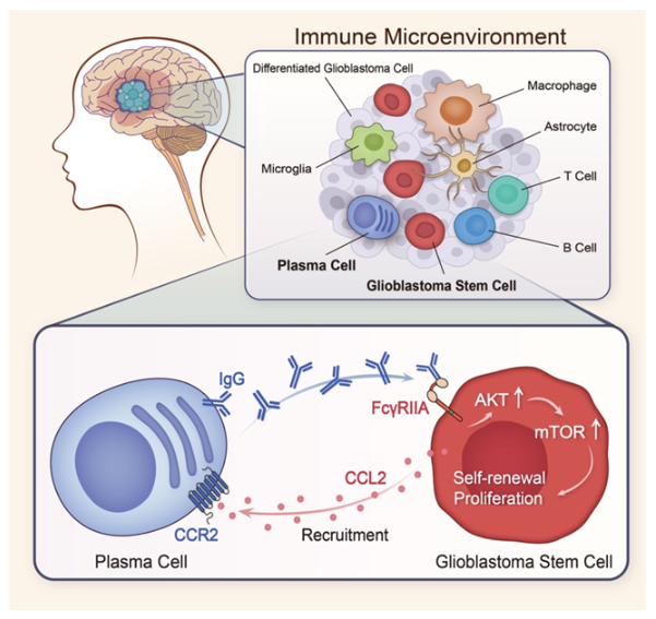 近日,基础医学院汪秀星教授与南京医科大学第一附属医院神经外科尤永平教授、中山大学附属第一医院神经外科张弩教授、南京大学模式动物研究所李颜教授、匹兹堡大学医学中心Jeremy N. Rich教授在《癌细胞》(Cancer Cell)杂志发表题为“肿瘤浸润浆细胞通过IgG结合维持胶质瘤干细胞(Infiltrating Plasma Cells Maintain Glioblastoma Stem Cells through IgG-Tumor Binding)”的研究论文,该研究明确了浆细胞与肿瘤干细胞信号交互在肿瘤恶性进展中的作用,为解析肿瘤免疫的精细调控提供了新的线索,为胶质母细胞瘤免疫治疗方案的制定提供了新思路。