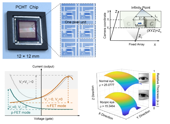 光电异质结晶体管阵列采用四端架构阵列设计实现动静态物体形态感知与记忆,并利用视差原理构建深度场重构方法,基于尺度不变特征转变(SIFT)的快速检测算法,对光电异质结集成阵列感知记忆的物体运动信息进行三维重构。该光电异质结晶体管集成阵列能够实现物体的多视角三维形态重构、二维深度场映射以及多视角耦合重构等功能。此外,研究团队利用该光电异质结集成系统实现对眼球形态的感知与重构,验证了该系统的三维重构功能在眼球角膜病变检测的应用可行性。