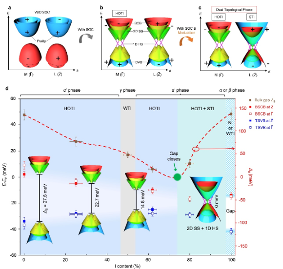 在此项工作中,研究团队利用角分辨光电子能谱、扫描隧道显微镜以及理论计算,研究了一种准一维材料体系——Bi4X4(X=Br,I),通过调控卤族元素Br和I的比例实现多重可控拓扑相变,进一步实现了双重拓扑序共存的拓扑量子材料。在该材料体系中,Bi元素提供强自旋轨道耦合作用,导致其电子结构具有双点双重能带反转(图a-b),产生高阶拓扑量子相。以此为基础,通过Br和I元素掺杂能够实现单点的能带交叉(图c),导致高阶拓扑和强拓扑的复合拓扑态诞生于Br:I摩尔比约2:8的Bi4X4晶体中。