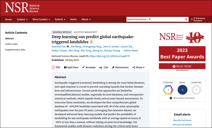 近日,成都理工大学范宣梅教授团队在全球地震诱发地质灾害智能预测方面取得重要进展,相关成果以“Deep learning can predict global earthquake-triggered landslides”为题,发表在国际顶级期刊National Science Review(《国家科学评论》,NSR,影响因子16.3)。
