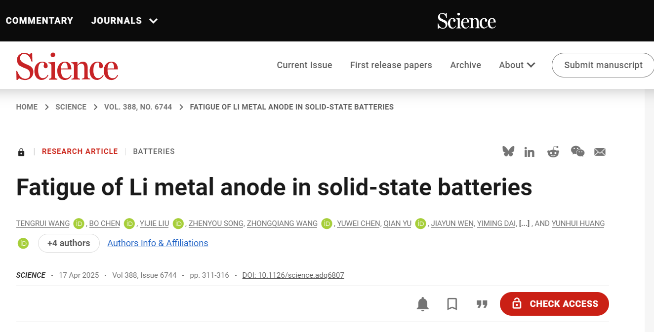 近期,国际顶尖学术期刊《科学》(Science)在线发表了同济大学材料科学与工程学院车用新能源研究院罗巍教授与合作者的研究论文,论文题为“Fatigue of Li metal anode in solid-state batteries”(固态电池锂金属负极的疲劳)。