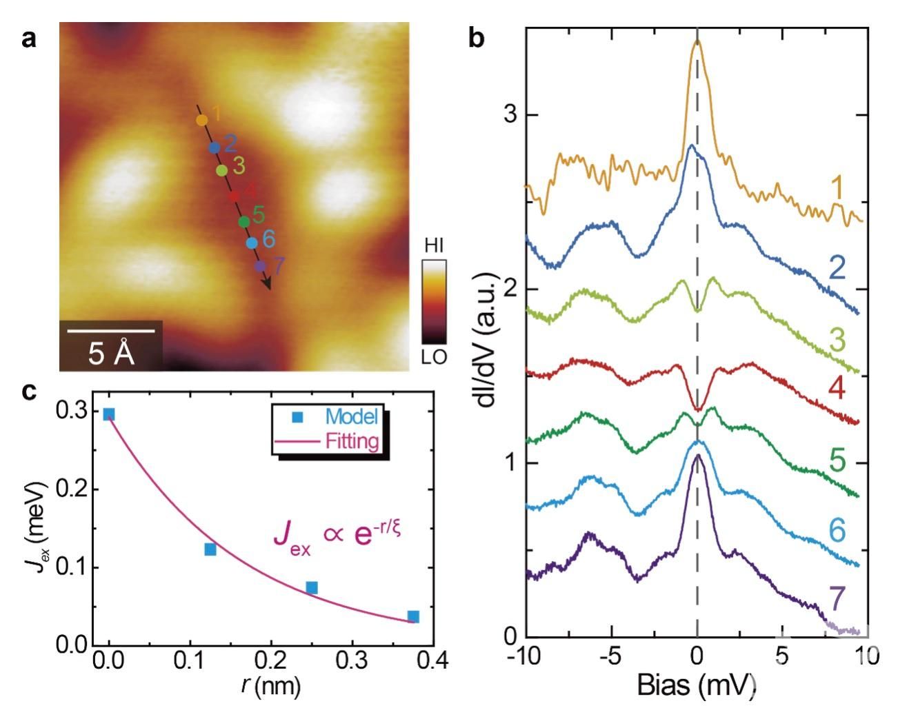 基于以上实验观测,团队的理论合作者发展了广义的Anderson模型和数值重整化群(NRG)方法来描述局域f磁矩与扩展π自旋之间的交换作用。该模型不仅能够解释实验中观察到的近藤共振的空间演变和零场劈裂现象,还为进一步研究单分子磁体中的磁相互作用提供了理论框架。此外,通过理论计算得到的交换耦合强度与实验结果相符,进一步支持了实验结论的可靠性,验证了理论模型的正确性和适用性。该研究在实验上直接探测到了稀土基SMMs中局域的4f电子自旋态,并揭示了其与配体π自由基自旋之间的空间依赖的交换相互作用,实现了对分子磁性的精确控制。这为深入理解单分子磁体中的磁耦合机制提供了重要信息。此外,通过电学手段调控TbPc2分子自旋态和近藤效应的策略,可实现了对分子磁性的精确控制,为量子信息和自旋电子学器件的研发提供了新的思路和方法。