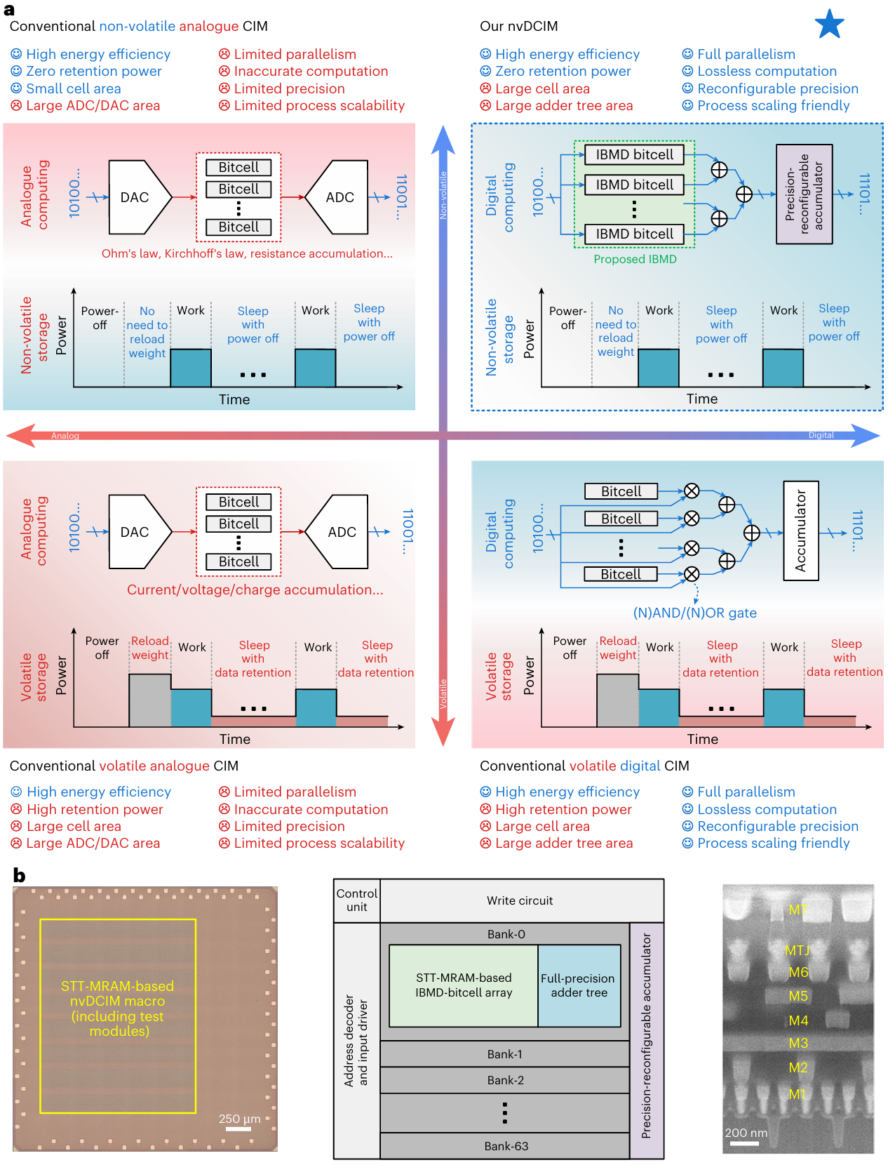 针对上述挑战,研究团队基于40纳米CMOS及STT-MRAM工艺,成功设计并流片验证了一款64kb非易失数字式存算一体(nvDCIM, non-volatile Digital Compute-in-Memory)芯片(图1)。该芯片在存储单元、电路与算法三个层面实现了系统性创新: