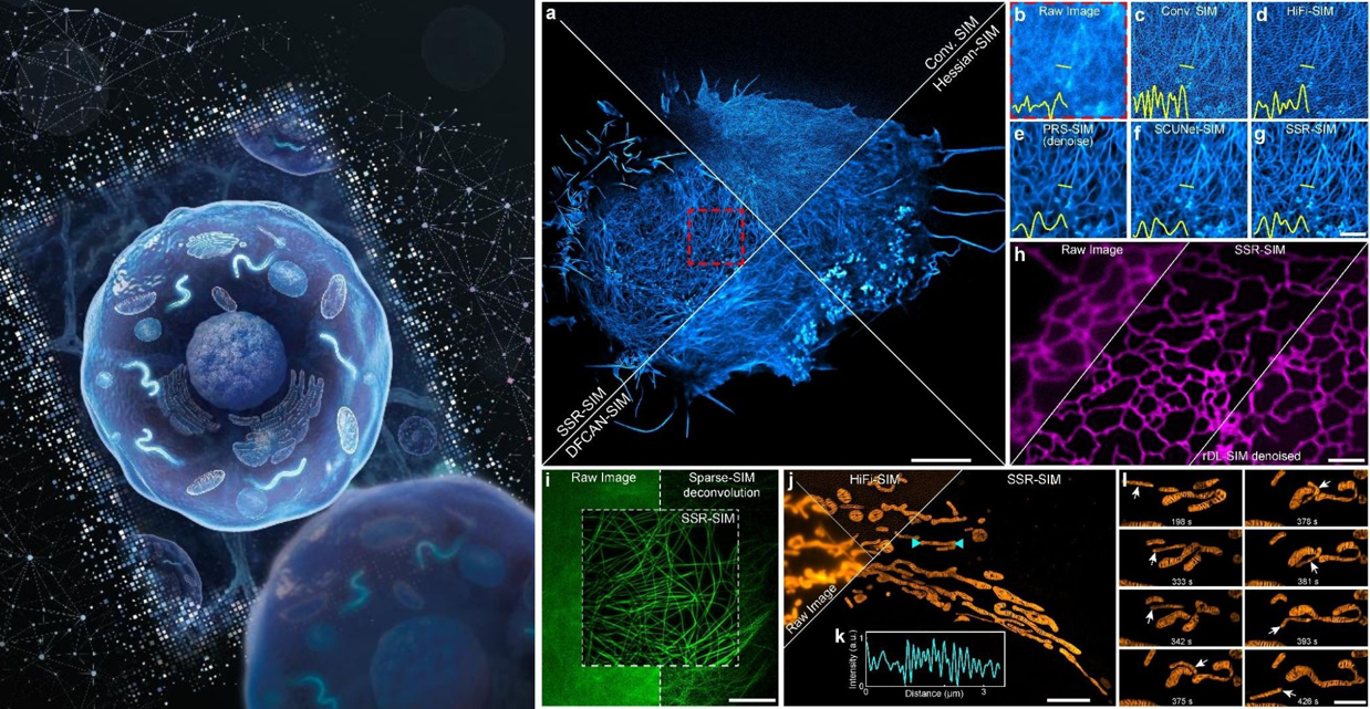 近年来,基于深度学习的结构光照明显微镜技术在长时程超分辨活细胞成像中展现出巨大潜力,为揭示亚细胞结构的动态过程与相互作用提供强大工具。现有方法严重依赖大量高质量“真值”图像进行监督训练,这些数据在光敏感、快速变化的生命过程中极难获取,限制了该技术的普适性。此外,主流端到端神经网络往往忽视超分辨成像物理模型,导致在低信噪比条件下重建保真度与分辨率下降。