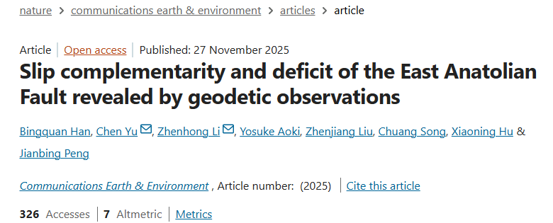 近日,长安大学李振洪教授团队在Nature子刊《地球与环境通讯》(Communications Earth & Environment)发表题为“Slip complementarity and deficit of the East Anatolian Fault revealed by geodetic observations” 的最新研究成果。长安大学为论文第一完成单位,团队韩炳权博士为第一作者,余琛教授与李振洪教授为共同通讯作者。合作者包括长安大学彭建兵院士、东京大学 Aoki Yosuke 教授、台湾大学胡植庆教授以及长安大学宋闯副教授。