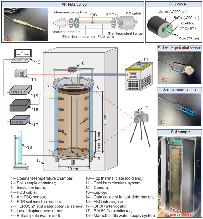针对这一难题,南京大学地球科学与工程学院朱鸿鹄教授团队在多年监测技术研发与冻土工程实践的基础上,成功研制国际首套“冻土光电联合多参量集成测试系统”(图1)。该系统以冻土相变界面行为精准捕捉为核心突破点,创新集成了分布式光纤传感、光电联合冰水含量推算、粒子图像测速变形追踪三类技术,实现了冻土温度、未冻水含量、含冰量、应变与位移等5类参量的同步获取(图2)。系统将传统监测的空间分辨率最高提升到毫米级、时间分辨率最高提升到秒级,为揭示土体内部多相界面耦合机制提供了直接观测依据。