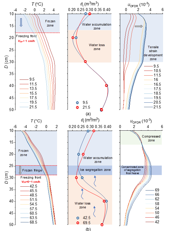 图4. 不同冻结阶段土体热水力响应特征:(a)快速冻结阶段与(b)缓慢冻结阶段土柱温度、含水率和应变分布剖面