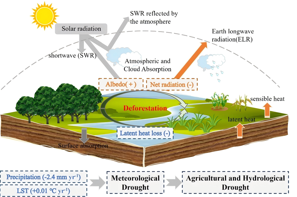 在全球变化驱动的水文循环演变背景下,森林作为陆地生态系统的核心,其覆盖变化对全球水分再分配具有深远影响。近日,河海大学地球科学与工程学院吴太夏教授领衔的水资源环境遥感研究团队,在《Science Advances》发表题为“Forest loss intensifies meteorological drought in over half of Earth’s climate zones”的研究成果。该研究首次系统性地评估了全球森林损失对不同气候带气象干旱的影响,并揭示了其背后的陆-气相互作用反馈机制(图1)。