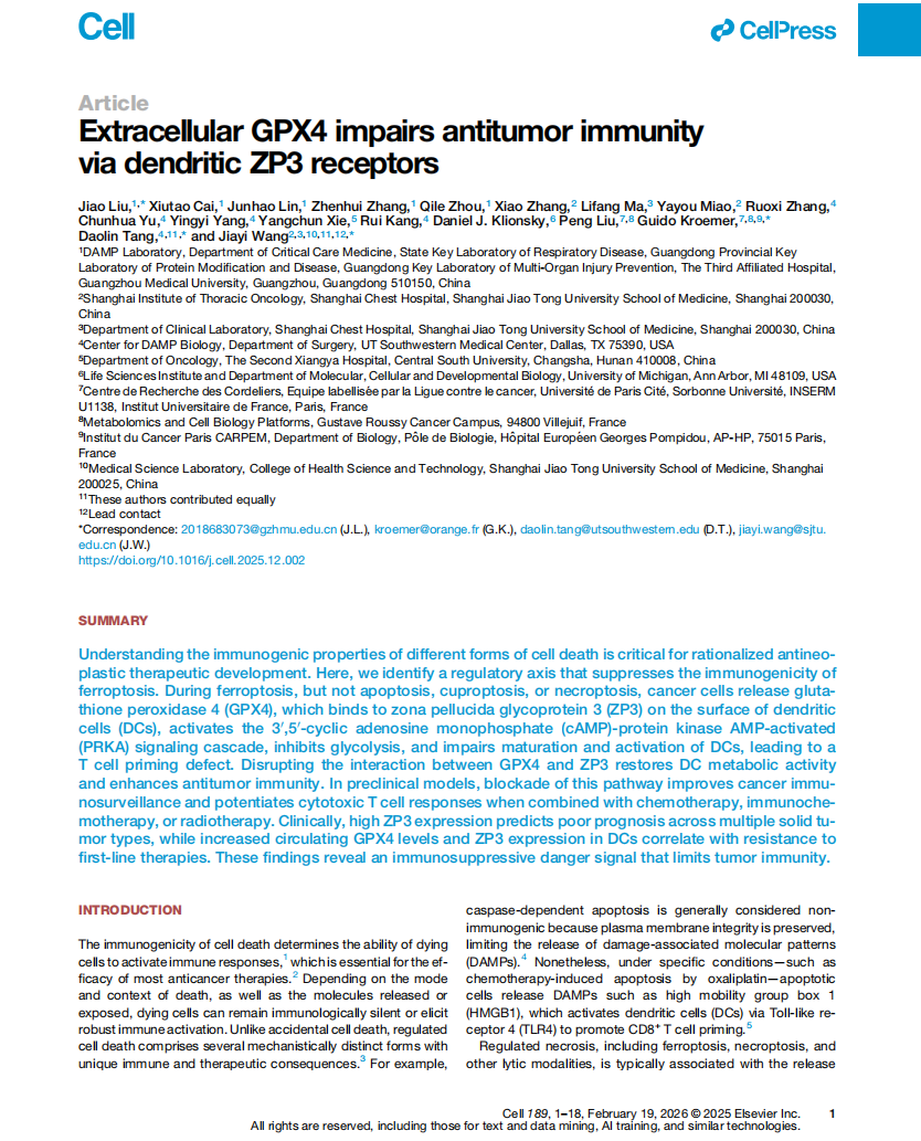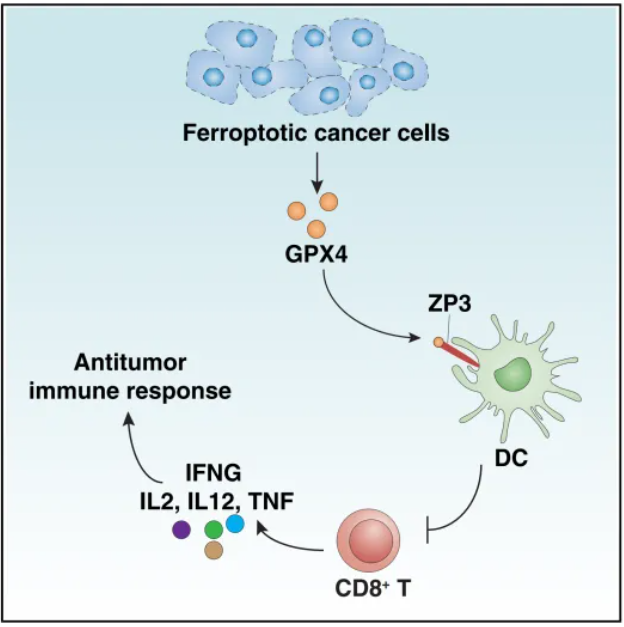 研究发现,铁死亡释放的 GPX4 会与树突状细胞表面的 ZP3 受体结合,这种结合会让人们整体的抗肿瘤免疫反应明显减弱。通过进一步对大量患者临床样本及公共数据库的系统分析,发现ZP3在胰腺癌、肺癌、肾癌等多种实体肿瘤中普遍出现较高含量,且个体含量越高,患者的预后往往就越差。与此同时,在部分对化疗反应不佳的胰腺癌患者中,研究人员观察到他们血液中 GPX4 水平明显升高。上述结果提示,GPX4 和 ZP3 不仅在肿瘤免疫抑制过程中发挥重要作用,还有可能成为评估免疫治疗疗效及患者预后的潜在“风向标”。
