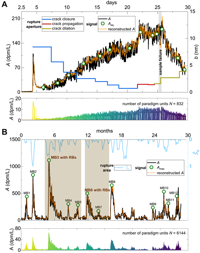 为此,研究团队首次提出了基于物理过程的天然放射性同位素长时序信号分解与重构方法,结合室内长周期岩石破裂试验、库岸边坡变形多年观测数据研究,发现了岩石变形破裂过程中同位素信号演化的通用范式曲线。该曲线由瞬时脉冲信号(Amax)与衰减稳态信号(Aeq)两大核心特征构成,并分别与岩石破裂面积(Se)与破裂开度(b)两大关键结构参数关联。通过严谨理论推导,结合系统刻画母核α衰变生成、子核α衰变消亡、裂隙壁面吸附–解吸附、沉淀及风化等复杂物理化学过程的同位素信号演化精细模拟,建立了天然放射性同位素特征信号与岩石破裂关键参数之间的本构关系,据此构建了岩石破裂定量诊断理论与预测方法,实现了单个微破裂离散信号与岩体宏观破裂信号的有机统一,完成了从定性观测到定量评估的关键跨越。