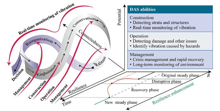 随着极端天气事件频率与强度持续攀升,洪水、滑坡、地面塌陷等灾害频发,严重威胁城市环境安全与社区生活稳定。新冠疫情等突发公共卫生事件引发的紧急管控措施,更进一步凸显了提升城市韧性的迫切性。在这一背景下,开发能够增强城市感知能力的智能监测系统,已成为推动智慧城市建设、提升城市韧性的重要趋势。分布式声波传感(DAS)技术凭借高空间分辨率与对现有光纤网络的复用能力,为城市韧性的动态感知提供了全新的技术路径。与传统监测手段(如摄像头、遥感或问卷调查)相比,DAS可直接利用城市中已有的暗光缆,实现全天候、实时、连续的高密度数据采集。它让原本沉默的光缆化身城市的“听觉神经”,随时捕捉人流、车流与环境振动的细微变化。尽管DAS在技术层面已显现出显著优势,但如何将其有效融入城市韧性的分析、评估与管理策略,目前仍缺乏系统性的研究框架与可推广的实践范式,亟待深入探索。