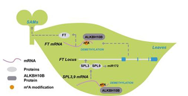 图. N6-甲基腺嘌呤去甲基酶ALKBH10B通过m6A介导调控拟南芥开花转化机理