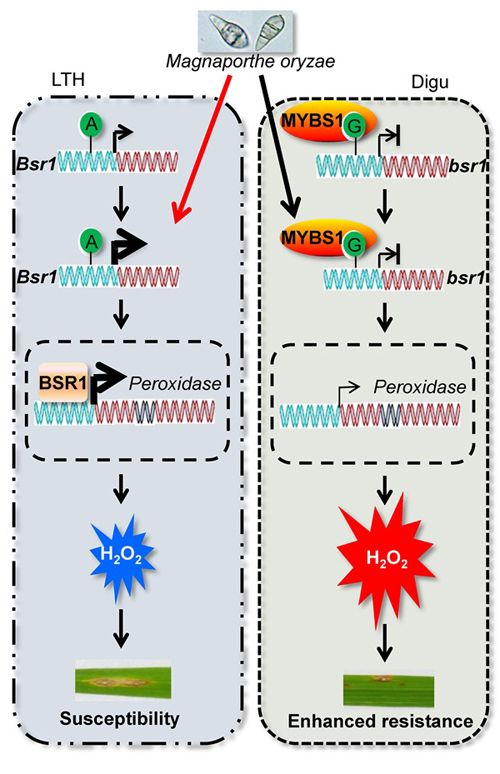 陈学伟教授团队以具有广谱高抗特性的水稻地谷为研究材料,利用GWAS(全基因组关联分析)和抗病性共相关分析,发现抗病性与编码C2H2类(锌指蛋白类)转录因子的基因Bsr-d1(广谱抗性地谷1)的启动子一个关键碱基变异存在共分离特性。同时发现,该碱基变异导致转录因子MYBS1(具有MYB结构域结合特征的转录因子)对Bsr-d1的启动子结合增强,从而抑制Bsr-d1响应稻瘟病菌诱导的表达,导致Bsr-d1所直接调控的H2O2(过氧化氢)降解酶基因表达下调,使H2O2降解减弱,细胞内H2O2富集,最终提高水稻的免疫反应和抗病性。该自然变异在提高水稻抗病性的同时,对产量性状和稻米品质并没有明显影响;分析发现全球26个国家的313份水稻资源含有该变异位点,表明该位点在育种应用中已获得一定程度的选择。这一研究结果不仅揭示了C2H2类型转录因子和MYB类型转录因子如何协调减弱H2O2的降解来提高水稻广谱抗病性的分子机制,而且为水稻稻瘟病广谱抗病育种提供了基础,也为其他粮食作物相关新型抗病机理的研究提供了重要借鉴。