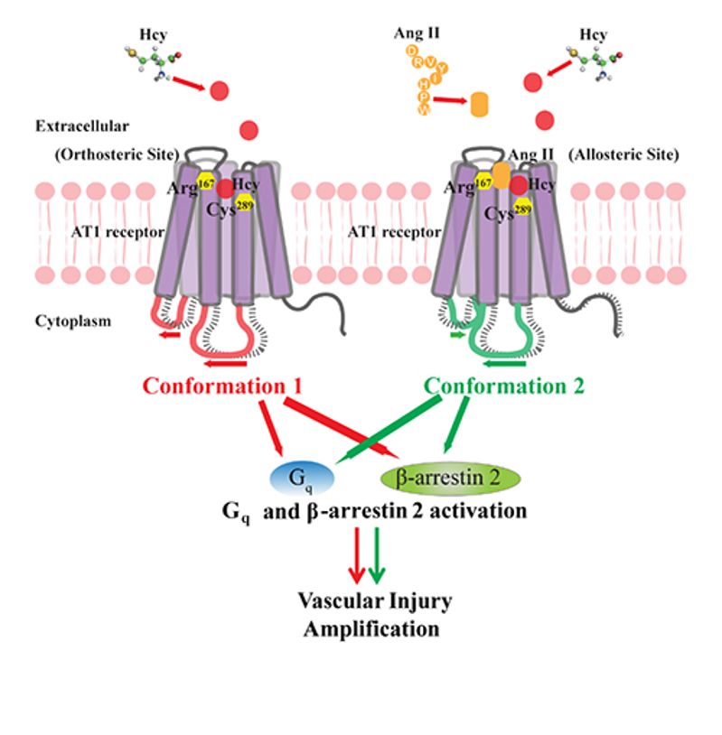 孔炜教授课题组之前发现高同型半胱氨酸血症是腹主动脉瘤新的危险因素,可被叶酸反转。其机制可能通过外膜炎症、NADPH氧化酶、去泛素化酶CYLD等机制加重腹主动脉瘤。该研究进一步通过腹主动脉瘤模型及AT1基因敲除小鼠、受体同位素结合实验、受体构象、计算机分子对接、分子动力学等研究手段,发现Hcy在病理浓度可通过盐桥和二硫键的形式分别结合AT1受体的Arg167和Cys289位点,通过正构和变构调节激活AT1受体及其下游的信号通路,其激活AT1受体的位点和方式与其经典配体AngII有所不同。阻断AT1受体(如通过AT1敲除小鼠或AT1受体拮抗剂ARB沙坦类药物)可取消高同型半胱氨酸对腹主动脉瘤的加重作用,而抑制AngII合成(如使用ACEI类药物)则没有相应的作用。该研究为高同型半胱氨酸血症相关大血管损害防治提供了新思路。