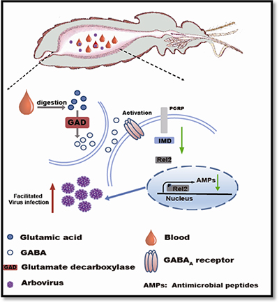 程功研究员团队利用登革病毒、乙型脑炎病毒等六种烈性蚊媒病毒及埃及伊蚊作为研究模型,通过RNA-Seq深度测序及功能学分析,鉴定出Gama-氨基丁酸(GABA)信号通路是多种蚊媒病毒感染蚊虫的共用感染辅助机制。蚊虫通过吸食感染宿主的血液获取病毒,同时吸取的宿主血液蛋白在蚊虫肠道中被降解成单个的氨基酸以便吸收,其中降解产生的谷氨酸可以被肠道细胞的谷氨酸脱羧酶转化成GABA,并激活GABA信号通路,进而抑制蚊虫免疫反应从而辅助不同种类的病毒高效率的感染蚊虫(见图)。该项研究阐明了一种广谱的、能够辅助不同种类蚊媒病毒在蚊虫体内感染的机制,为深入理解“病毒-蚊媒”之间互作关系奠定新的理论基础。