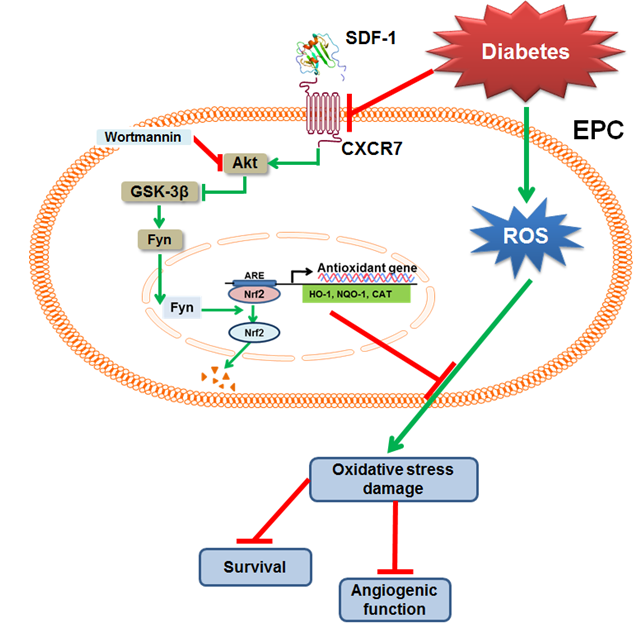 图 SDF-1/CXCR7在糖尿病EPCs中的作用示意图。糖尿病降低EPCs中CXCR7的表达,并抑制Akt/GSK-3β/Fyn信号介导的Nrf2核转位和下游靶基因的转录激活,从而引起氧化应激的增加,导致EPCs存活下降和血管生成功能受损。