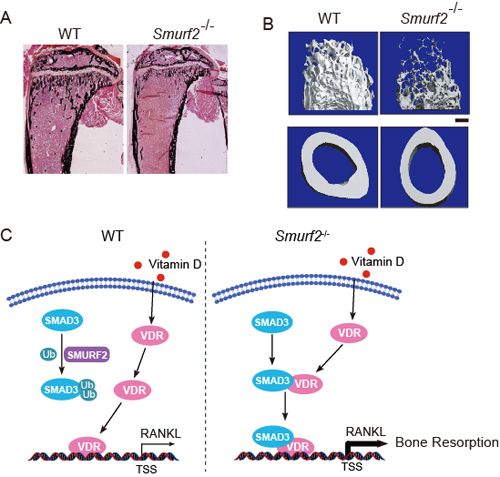 邹卫国研究员团队在研究中发现,Smurf2基因敲除小鼠长骨骨密度降低(图A、B),产生了类似人类骨质疏松的症状。进一步分子机制研究表明,泛素连接酶SMURF2通过调节SMAD3的泛素化,影响SMAD3与维生素D受体的相互作用,干预成骨细胞中对稳态维持起重要调节作用的信号分子RANKL的表达,从而维持骨骼系统的平衡(图C)。这项研究发现并阐明了骨骼系统稳态维持的新机制,提示靶向调控SMURF2可能是防治骨质疏松症的一个新策略。