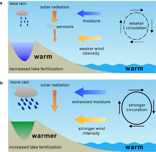已有研究认为,亚洲地区的快速工业化和城市化发展导致近几十年来该地区气溶胶含量显著增多,在亚洲大陆上空产生“阳伞效应”,导致海陆热力差异减小,进而导致亚洲夏季风减弱。在当前变暖背景下,气溶胶导致的这种夏季风减弱,使得该区域水生生态系统是否受到影响,已经发生哪些变化或可能存在哪些潜在的变化过程?这些问题对阐明全球变暖对湖泊环境的影响均至关重要。陈发虎研究组等依托位于山西西部黄土高原上过去2000年的高山湖泊记录,发现在自然暖期下,季风降水增强导致更多的营养物质被侵蚀输入到湖泊,致使湖泊发生了显著的富营养化;而在现代暖期,由于季风减弱,导致被侵蚀到湖泊中营养物质减少,致使湖泊并未发生富营养化。因此,在现代气候变暖背景下,快速工业化产生的气溶胶造成亚洲夏季风减弱的影响是导致其对高山湖泊生态和环境产生了不同于自然暖期下的影响过程的主要因素(下图)。研究组通过研究还指出,未来人为气溶胶的减排以及全球气候的持续变暖,将可能导致亚洲夏季风气候又返回自然变暖下季风增强的状态,从而可能导致更多营养物质输入到高山湖泊中,进一步加剧高山湖泊的生态退化,使该地区已经较为紧张的淡水供应的形势更加严峻。