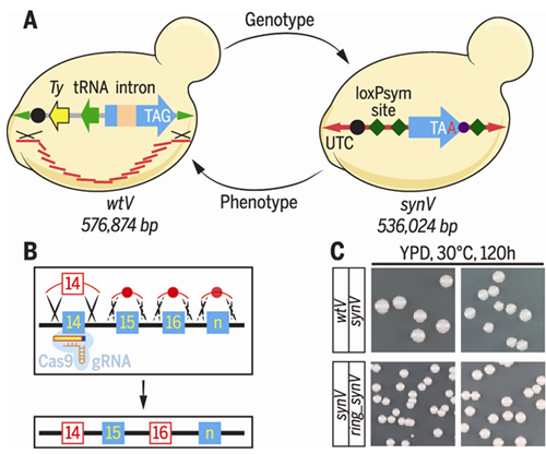 在设计合成酵母五号染色体研究中,元英进团队创建了多级模块化和标准化染色体合成方法,建立了一步法大片段组装技术,实现了由小分子核苷酸到活体真核染色体的定制精准合成;建立了基于多靶点片段共转化的基因组精确修复技术,实现了真核染色体化学合成序列与设计序列的完美匹配。该技术的突破为基因组的重新设计、功能验证与技术改进奠定了基础。该团队设计构建了一组合成酵母五号染色体环形模型,并通过人工基因组中设计的特异标签实现对细胞分裂过程中染色体变化的追踪和分析,为研究当前无法治疗的环形染色体疾病的发生机理和潜在治疗手段建立了研究模型。