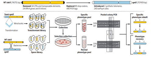 在设计合成酵母十号染色体研究中,元英进团队开创性地利用加注的标签系统和混菌策略,创建了一种高效定位缺陷靶点的方法,即“混菌PCR标签定位法”(pooled PCRTag mapping,PoPM)。通过缺陷靶点的定位与修复,挖掘出了未知的酵母生物学新知识,如:YJR120W基因的3,端loxPsym位点的引入影响附近基因ATP2的表达;必需基因FIP1重编码会引入新的转录因子Rap1p的潜在结合位点。另外,利用酵母减数分裂同源重组机制,修复了合成型染色体上的大片段重复和重排的变异结构。PoPM可适用于任何有水印标识的合成型染色体的缺陷定位,是排除化学基因组缺陷的有力工具,也是定位表型和基因型关系的新策略,将显著提升人类对基因组结构和功能的理解。