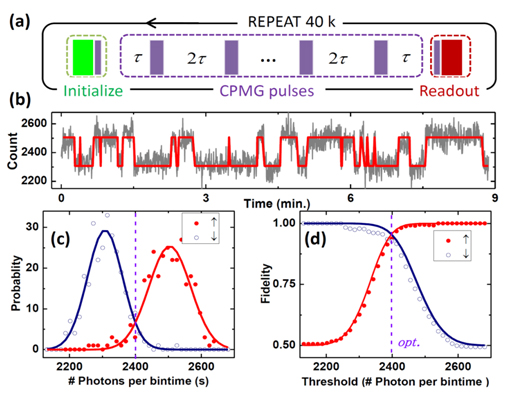 图.室温下单个核自旋量子跳变的实验信号及保真度分析。其中(a)是实验CPMG脉冲序列;(b)是实验观测到的典型的量子跳变信号;(c)和(d)的数据分析显示单次读出核自旋量子态的保真度为95.5%。