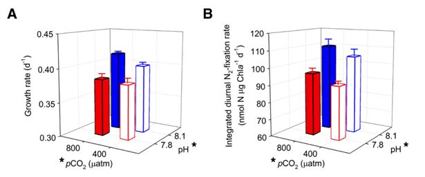 在束毛藻生活的寡营养海区,痕量金属铁是其生长和固氮作用最重要的限制因子之一。然而,先前报道海洋酸化促进束毛藻固氮作用的室内研究,使用的均是富营养的人工海水培养基。史大林教授研究团队采用痕量金属洁净操作技术,以天然寡营养海水为培养基开展研究,并创新性地从区分海洋酸化过程中CO2上升和pH下降的双重效应入手,发现CO2升高对束毛藻固氮的促进作用弱于海水pH下降对其的抑制作用(见图2),导致海洋酸化的净效应为抑制束毛藻固氮,且该负效应随着海水中铁浓度的下降而增强。实验表明,藻细胞内的pH随着海水pH的下降而下降,束毛藻上调固氮酶的表达以应对由此引起的固氮速率降低,同时加大能量生产用以维持细胞内的pH稳态(pH homeostasis)。鉴于固氮酶合成和能量生产过程对铁的高度需求,铁限制条件加剧了酸化的负效应。此外,通过系统的受控培养实验,研究团队发现先前其他研究小组报道的海洋酸化对束毛藻固氮的促进作用,很可能是因人工海水培养基中金属和氨的污染所导致的假象。在室内实验的基础上,史大林教授研究团队在国际上首次对铁限制下的天然束毛藻群落开展了酸化研究,通过在南海寡营养海区的现场痕量金属洁净受控培养实验,发现海水酸化在降低固氮速率的同时上调了固氮酶基因的转录,表明酸化导致固氮效率下降,这与实验室的机理研究结果相吻合。该研究成果不仅揭示了海洋酸化对束毛藻的影响及其机制,而且为先前国际上就该科学问题的争议提供了科学解释,对于深入理解全球变化下碳、氮的海洋生物地球化学循环具有重要的意义。