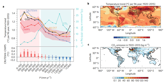 图.干旱地区和湿润地区的温度趋势和历史二氧化碳排放量。(a)表示增温趋势和二氧化碳排放量随年降水量的空间变化存在明显的不对称性,图中的黄线、蓝线和黑线为三种国际常用的气温观测资料、红线为多个气候模式的平均结果。柱状条表示观测资料与多气候模式平均的温度趋势之间的差异,误差棒和红色阴影表示不同气候模式之间的不确定度。(b)表示增温最显著的区域大多位于干旱半干旱区,图中给出了1920-2015年地表气温趋势的全球分布,灰色阴影表示干旱半干旱区。(c)表示二氧化碳的历史高排放区域均位于湿润区,图中给出了1920-2013年二氧化碳人为排放量的全球分布,灰色阴影表示湿润区。