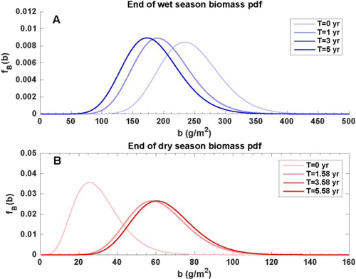 图1 经历不同时段干湿季交替的湿润季末(A)和干旱季末(B)生物量分布