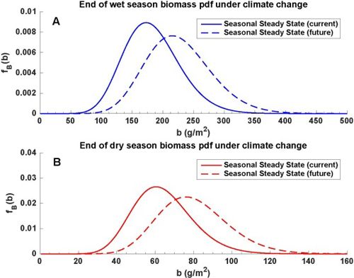图4 降水变化情景下(Gaoet al., 2012)湿润季末(A)和干旱季末(B)的生物量分布