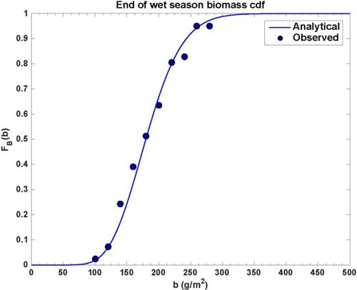 图2 湿润季末生物量累积分布概率模型预测值与实际观测值比较