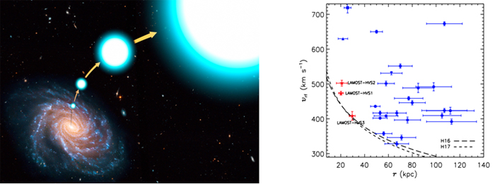 左图. 超高速星逃逸出银河系想象图(采自NASA);右图. 此次LAMOST发现的两颗超高速星LAMOST-HVS2和LAMOST-HVS3。