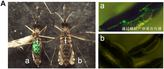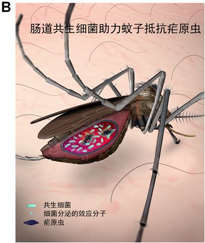 图. (A)在按蚊中进行持续跨代传播的新共生细菌,能高效驱动抗疟效应分子快速散播到整个蚊群中;(B)使按蚊成为无效的疟疾媒介,实现从源头上阻断疟疾传播。