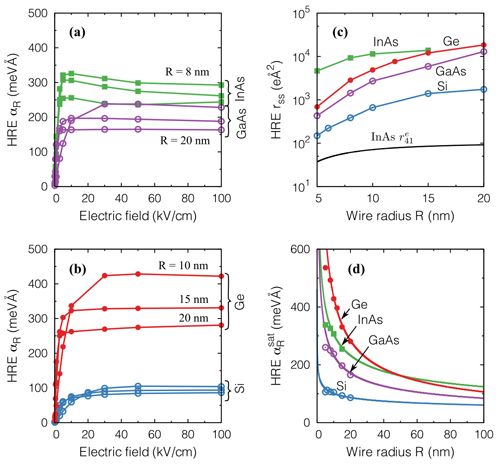 图(a)和(b)显示硅、锗、InAs和GaAs量子线空穴Rashba效应在电场作用下的响应,(c)和(d)分别是Rashba效应的响应速度和饱和值随量子线大小的变化。