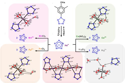 实验中,通过氧化切断芳基五唑的C-N键,得到稳定的白色固体粉末NaN5水合物,重结晶得到[Na(H2O)(N5)]•2H2O,用高分辨质谱和15N核磁表征确证其结构。分别通过NaN5水合物与MnCl2, FeCl2, Co(NO3)2, MgCl2之间的离子交换反应,得到相应的化合物粗品,经重结晶后分别得到[Mn(H2O)4(N5)2]•4H2O, [Fe(H2O)4(N5)2]•4H2O, [Co(H2O)4(N5)2]•4H2O, 和 [Mg(H2O)6(N5)2]•4H2O,通过单晶X-射线衍射分析,确认5个化合物的晶体结构。其合成过程和晶体结构见下图。