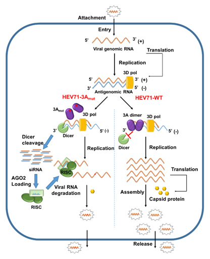 在该研究中,研究者利用人肠道病毒71型(EV71)感染的人类体细胞及小鼠为模型,发现其非结构蛋白3A具有RNAi抑制子(VSR)功能。3A能够通过与病毒dsRNA结合来阻止Dicer对其剪切,抑制vsiRNAs的产生。当3A的VSR活性被缺失,VSR缺陷型EV71病毒能在细胞与小鼠中激发RNAi反应,并产生大量vsiRNAs。这些vsiRNA通过Dicer剪切病毒dsRNA产生、被装配进RISC、并高效的介导同源病毒RNA的降解。在正常的人体细胞和小鼠中,VSR缺陷型病毒的复制被极大的抑制;而在RNAi通路缺失的细胞中,突变病毒的复制得到显著的拯救。同时,研究者们还证明RNAi在哺乳动物中所发挥的抗病毒作用不依赖于干扰素反应。