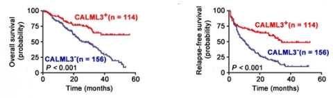 课题组在体内外实验中发现,CALML3是一个抑癌基因,它对肝癌生长和肺转移有明显的抑制作用。在270例肝癌手术切除患者中114例CALML3表达阳性,而这些表达阳性的患者术后生存率显著高于156例CALML3表达阴性者,而且CALML3表达阳性复发转移率也显著低于表达阴性者。