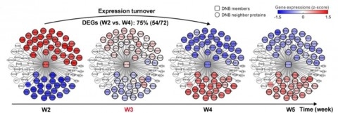 课题组利用高转移人肝癌裸鼠模型,采用全基因组转录表达谱芯片,测定肝癌肺转移不同阶段的基因变化,利用原创性的动态网络生物标记物(Dynamic network biomarker,简称DNB)方法,发现肿瘤移植后第3周是肝癌肺转移发生的临界阶段,并成功鉴定具有“早期预警价值”的DNB核心基因。为了深入探讨DNB核心基因在促肝癌肺转移发生的作用机制,课题组进一步鉴定到DNB中起重要作用的CALML3,对其在肝癌肺转移中的作用及临床预后价值进行深入研究。