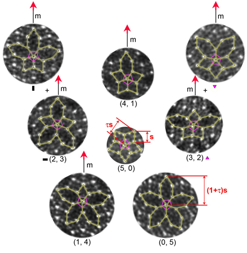 图4.析出相中显示理想的五次旋转对称性的二十面体串(紫色五边形所示)处的四棱柱和扁六棱柱排列规律。m代表对称元素—“镜面”,s代表相邻两个共面二十面体之间的距离(~0.45nm),