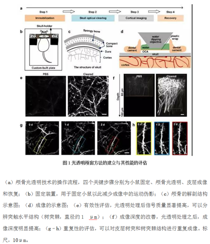 朱䒟教授课题组率先在国际上开展活体组织光透明研究,早期的工作主要针对不同类型的皮肤光透明而展开。其同事许彤辉教授一直从事小鼠皮层神经成像研究,混浊颅骨已成为制约皮层光学成像应用的瓶颈问题。双方在交流中,朱䒟意识到神经科学家的重大需要,将活体光透明的研究重点转移到了颅骨。经过6年的努力,课题组针对不同年龄小鼠开发出安全、有效、可开合的光透明颅窗。该技术不仅能够有效提高多种光学成像在活体皮层成像的对比度与成像深度,也实现了对突触分辨水平的神经结构可塑性的成像研究。该工作有望为生理/疾病状态下皮层神经与血管结构与功能性成像研究提供重要工具。