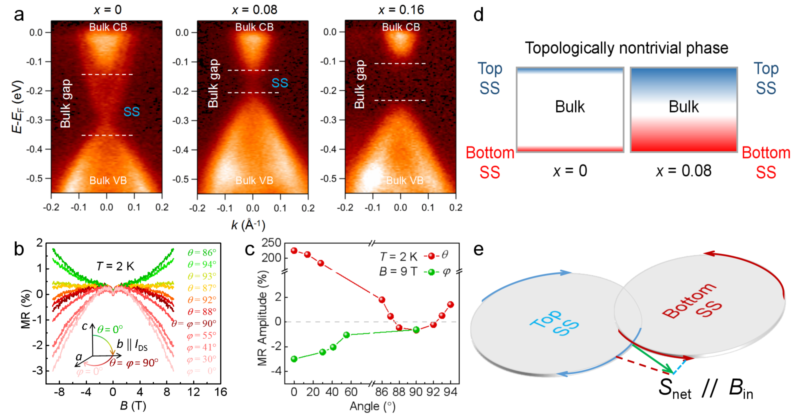 图2. 拓扑量子相变诱导的(Bi0.92In0.08)2Se3三轴各向异性磁电阻:(a) (Bi1–xInx)2Se3 (x = 0, 0.08 & 0.16)的ARPES谱;(b) 三轴矢量磁电阻曲线;(c) 面内和面外不同角度的磁电阻强度;(d) 拓扑相变导致纳米薄片上下表面态的量子相干增强的耦合效应示意图;(e) 在上下表面态相干耦合时,施加面内磁场的自旋极化示意图。